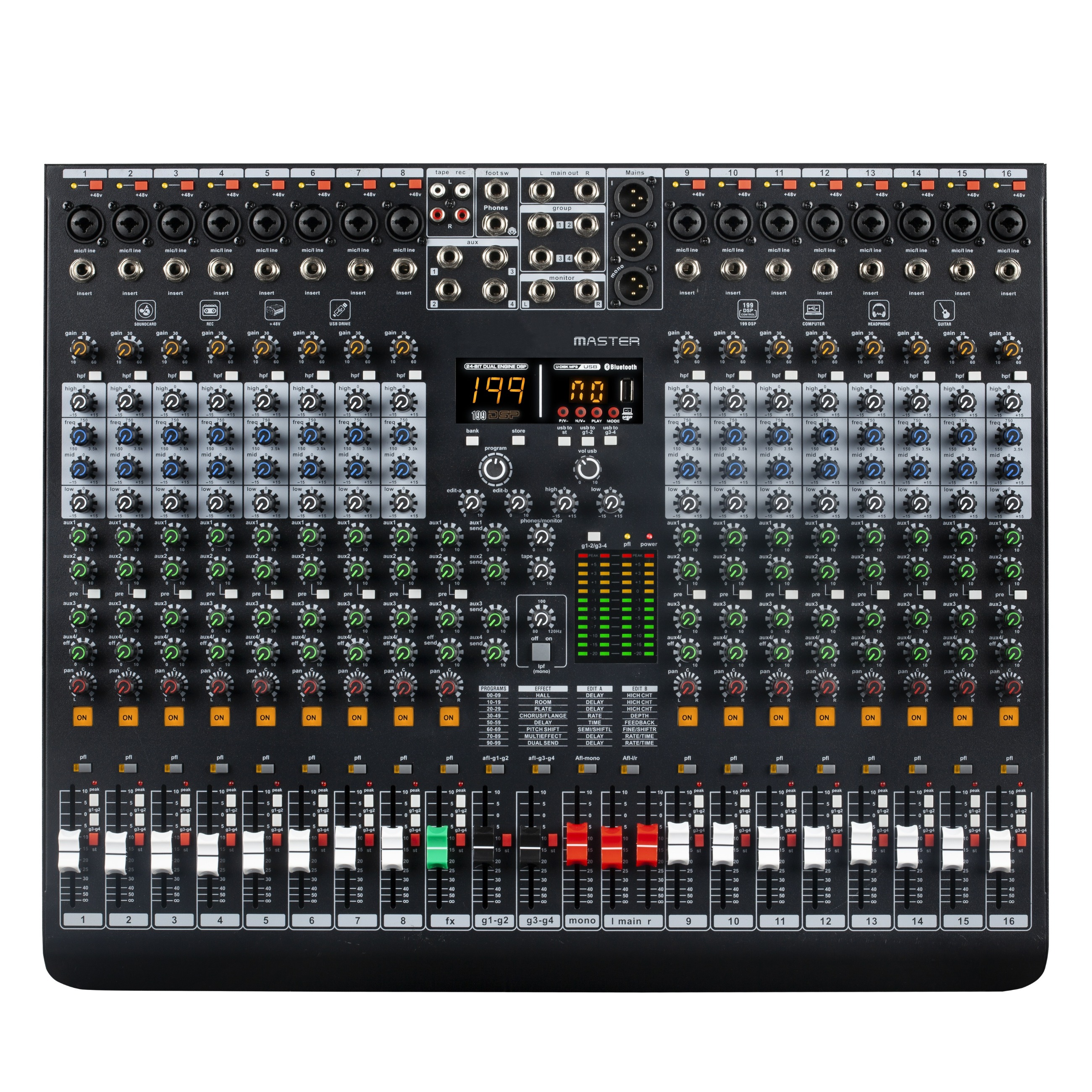 功能特點(diǎn):1.專業(yè)調(diào)音臺(tái),采用超低噪聲離散式麥克風(fēng)前置放大器和+48V幻象電源,功能強(qiáng)大齊全,音質(zhì)動(dòng)聽。2.提供16路Mic輸入接口兼容16路線路輸入接口,16路斷點(diǎn)(INSERT)輸入,每通道帶低切功能。3.提供16路每通道+48V幻象電源,主聲4排電平燈。4.每路單聲道輸入通道設(shè)有4段EQ(立體聲三段),分路通道設(shè)有壓限控制,設(shè)有峰值指示燈。5.提供4組輔助輸出、4編組輸出、1組立體聲監(jiān)聽輸出