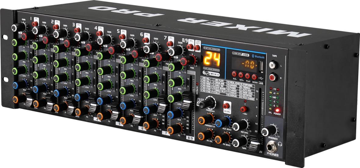 4.每路單聲道輸入通道設有3段EQ,設有峰值指示燈。